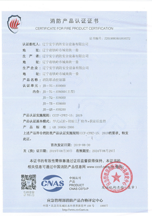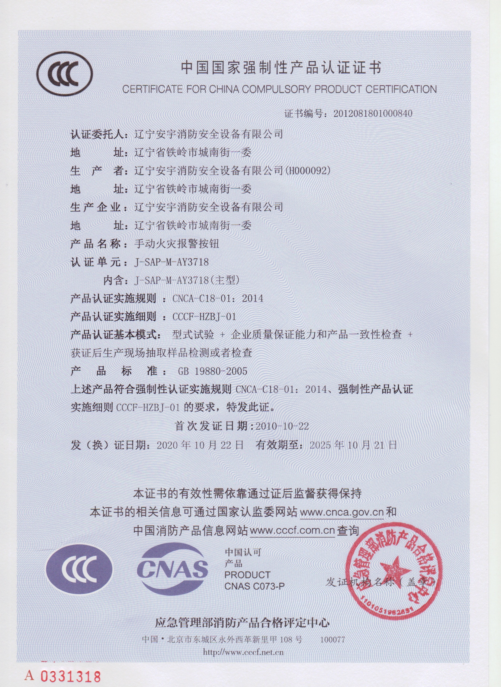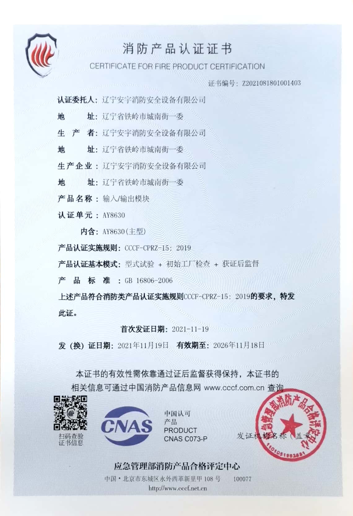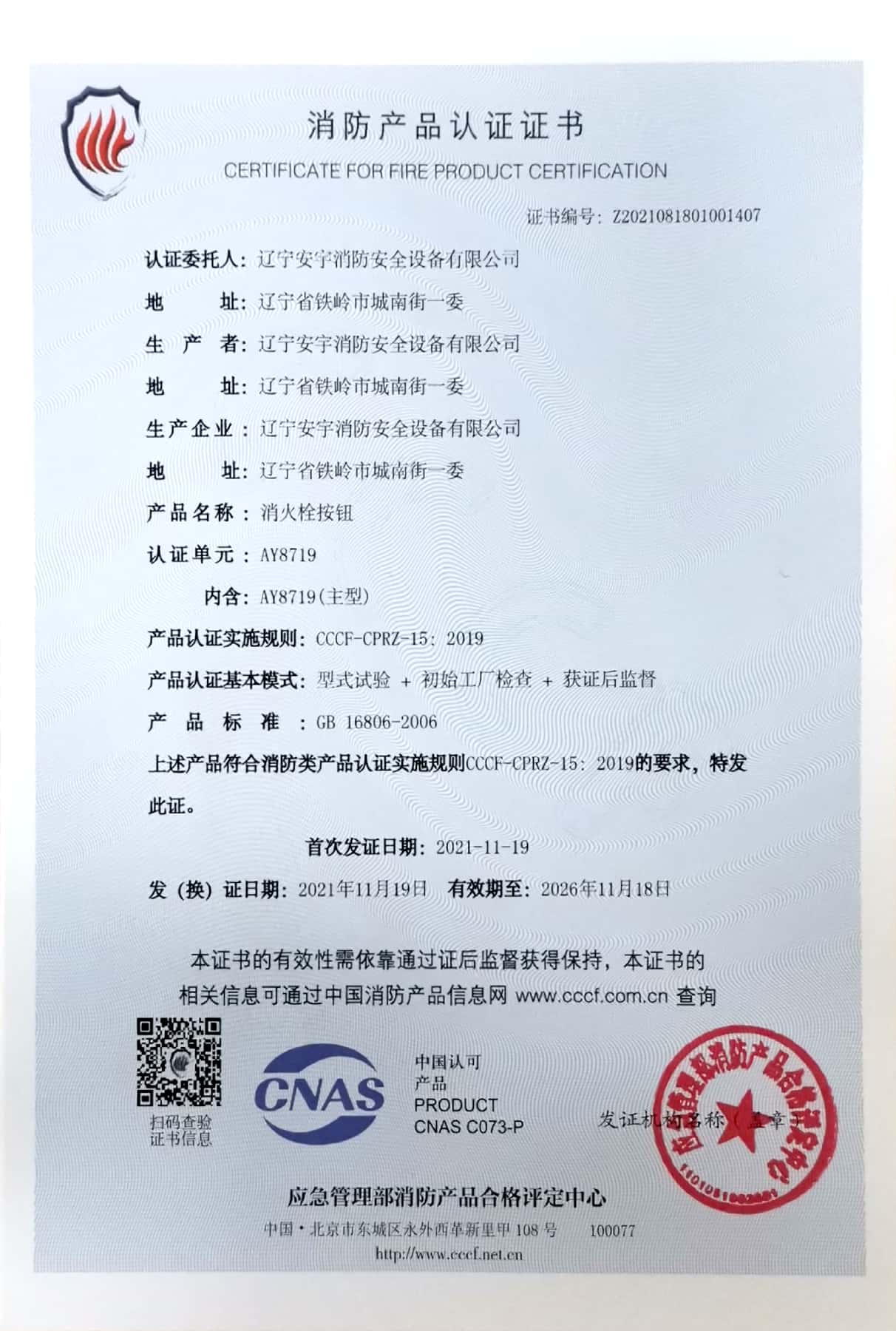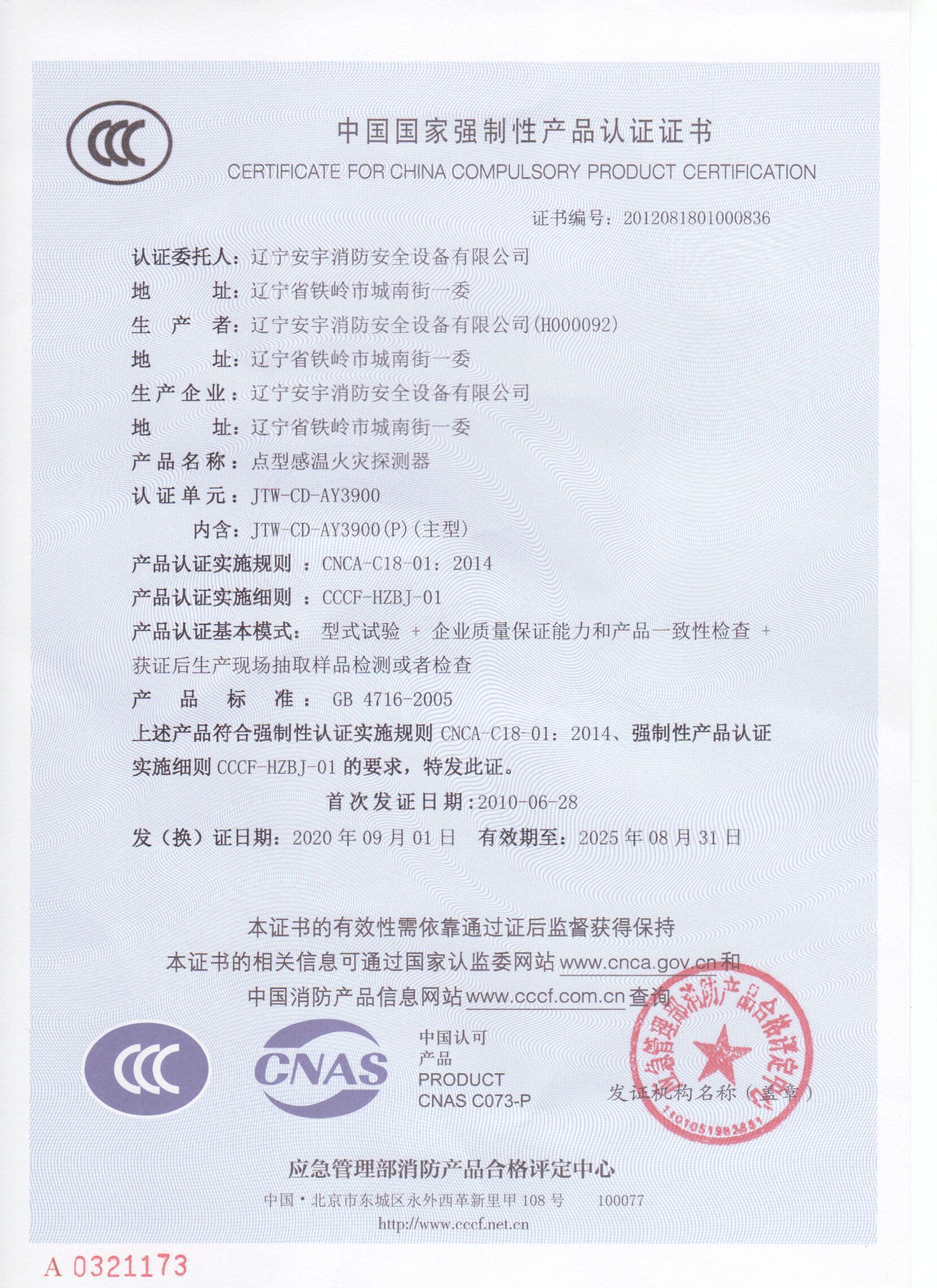 公司以高素質的職業化人才隊伍、完善的現代化管理機製和質量管理(lǐ)體係,獲得了中國認證機構國(guó)家認可委員會(CNAB)認可的中國質量認證中心(CQC)質量管理體係認(rèn)證公安部消防產品合格評定中心的產品質量認證中(zhōng)國強製性產品認證(China Compuisory Certification ,簡稱3C)認證,使安宇產(chǎn)品在技術(shù)含量及產(chǎn)品的質量和穩定性方麵始終處於國際同行(háng)業前端水(shuǐ)平。